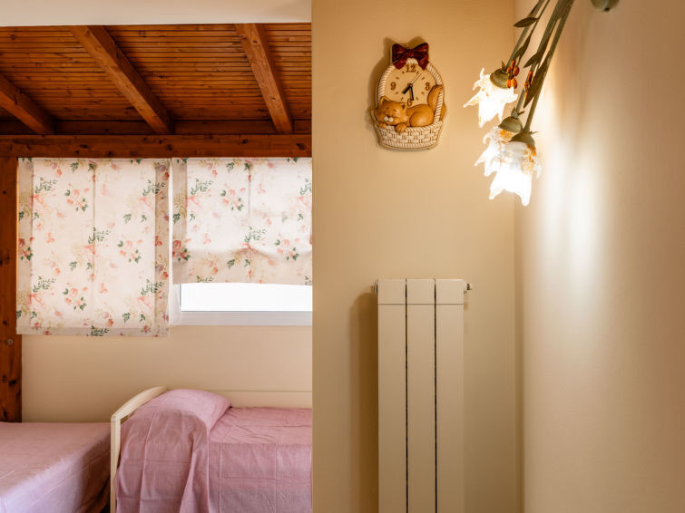 "Piccola Felicita", maison jumelée 3 pièces 80 m2, au rez-de-chaussée. Aménagement plaisant: séjour/salle à manger avec 1 divan-lit (120 cm, longueur 200 cm). Sortie sur le jardin. Cuisine ouverte (four, 4 feux, grille-pain, bouilloire électrique). Douche/bidet/WC. Chauffage au gaz. Possibilité de chauffage uniquement du 01.11. au 15.04. À l'étage supérieur: 1 chambre double. 1 chambre avec 2 lits (90 cm, longueur 200 cm). Sortie sur le balcon. Balcon, terrasse. Meubles de terrasse. Vue sur les alentours et la localité. A disposition: lit bébé jusqu'à 2 ans, sèche-cheveux. Internet (Connexion WIFI, gratuit). Veuillez noter: maximum 1 animal/ chien autorisé. Entrée privée. IT008059B4MVZ2VT3P