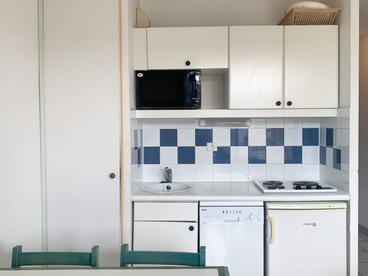 Appartement 2-kamers 28 m2 op de 4e verdieping. Woon-/eetkamer met 1 uitschuifbaar bed (2 pers. 2 x 90 cm, lengte 190 cm), TV. 1 kamer met 1 2-pers bed (1 x 140 cm, lengte 190 cm). Kookhoek (3-pits kookplaat, afwasmachine, waterkoker, magnetron). Badkamer, aparte WC. Elektrische verwarming. Terras 7 m2, op het westen gelegen. Terrasmeubelen. Zijdelings uitzicht op zee. Ter beschikking: Internet (Internet (WiFi), extra). Parkeerplaats. Rookmelders.