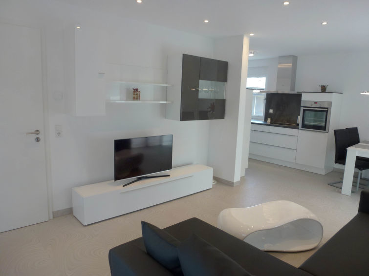 Appartement 2-kamers 58 m2 op de 1e verdieping. Licht, comfortabel en smaakvol ingericht: woon-/eetkamer met 1 2-pers divanbed en Sat-TV (Flatscreen TV), air-conditioning en elektrische rolluiken. Uitgang naar het balkon. 1 2-pers. kamer met air-conditioning en elektrische rolluiken. Kookhoek (oven, afwasmachine, 4 keramische glas kookplaten, magnetron, elektrische koffiemachine). Douche/WC. Vloerverwarming. Balkon 22 m2. Balkonmeubilair, ligstoelen (2), bergruimte. Ter beschikking: wasmachine, strijkijzer, haardroger. Internet (Internet (WiFi), gratis). Niet rokers woning. Rookmelders. DE308725270