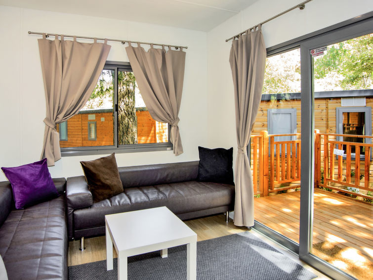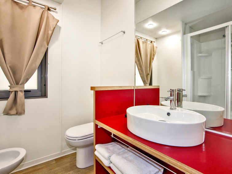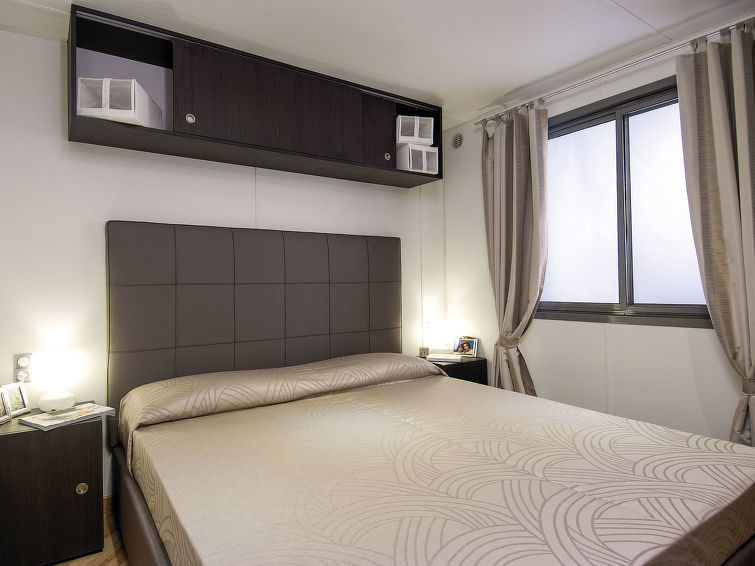 "Deluxe", 3-kamers mobilhome 45 m2, op verhoogde begane grond. Modern en smaakvol ingericht: woon-/slaapkamer met 1 slaapplaats (80 cm), eettafel, TV en air-conditioning. Uitgang naar het terras. 1 kamer met 1 2-pers bed (170 cm). 1 kamer met 2 bedden (70 cm, lengte 180 cm), 1 x 1 stapelbedden (70 cm, lengte 180 cm). Open keuken (4 inductiekookplaten, diepvriezer). Douche/WC. Elektrische verwarming. Terras overdekt. Terrasmeubelen. Ter beschikking: Internet (Internet (WiFi), gratis). Rookvrij huis. IT053006B1Z27P3GUF