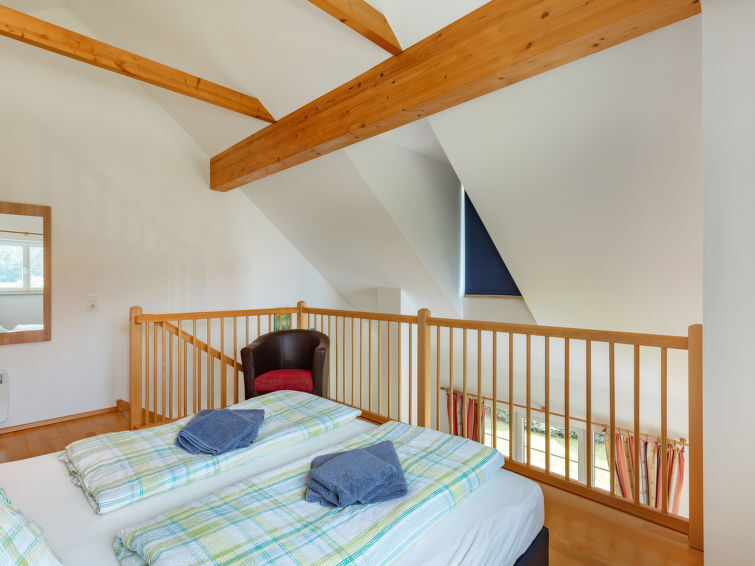 "Top 6", maisonette 3-kamers 65 m2 op 2 verdiepingen, op de bovenverdieping. Gedeeltelijk afgeschuinde daken, comfortabel en gezellig ingericht: hal. Woon-/slaapkamer met 1 2-pers divanbed (160 cm), zwedenkachel, eettafel, Sat-TV, Flatscreen TV en DVD. Uitgang naar het balkon. 1 2-pers. kamer met douche. Open keuken (oven, afwasmachine, 4 keramische glas kookplaten, elektrische koffiemachine). Aparte WC. Zolderverdieping: galerij met 1 2-pers bed en bad/WC. Parketvloeren. Balkon. Balkonmeubilair. Mooi panoramazicht op de skipiste en het landschap. Ter beschikking: wasmachine, droger. Internet (Internet (WiFi), gratis). Garage nr. 6 (1 Auto). Niet rokers woning. Op de slaapgalerij bevindt zich ook nog kastruimte. In plaats van een afgesloten slaapkamer bevinden sommige slaapgedeeltes zich in een open ruimte (galerij, nis, etc.). 50508-002506-2020